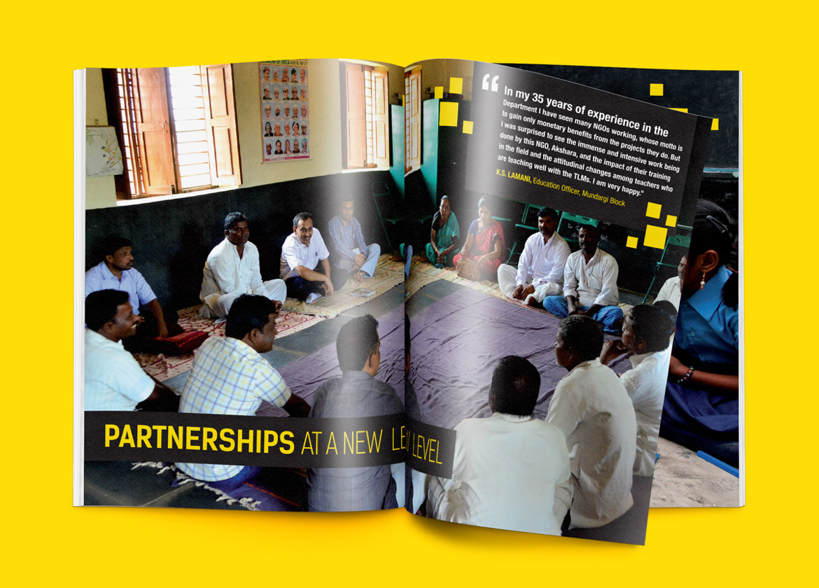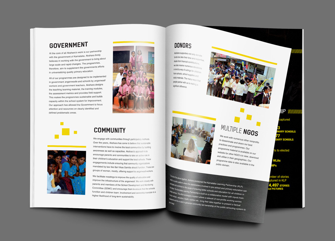 Communication, ReportAs long time collaborators, we have designed most of the award winning annual reports for Akshara Foundation, a non-profit that works to provide educational programmes and solutions to government schools in Karnataka.