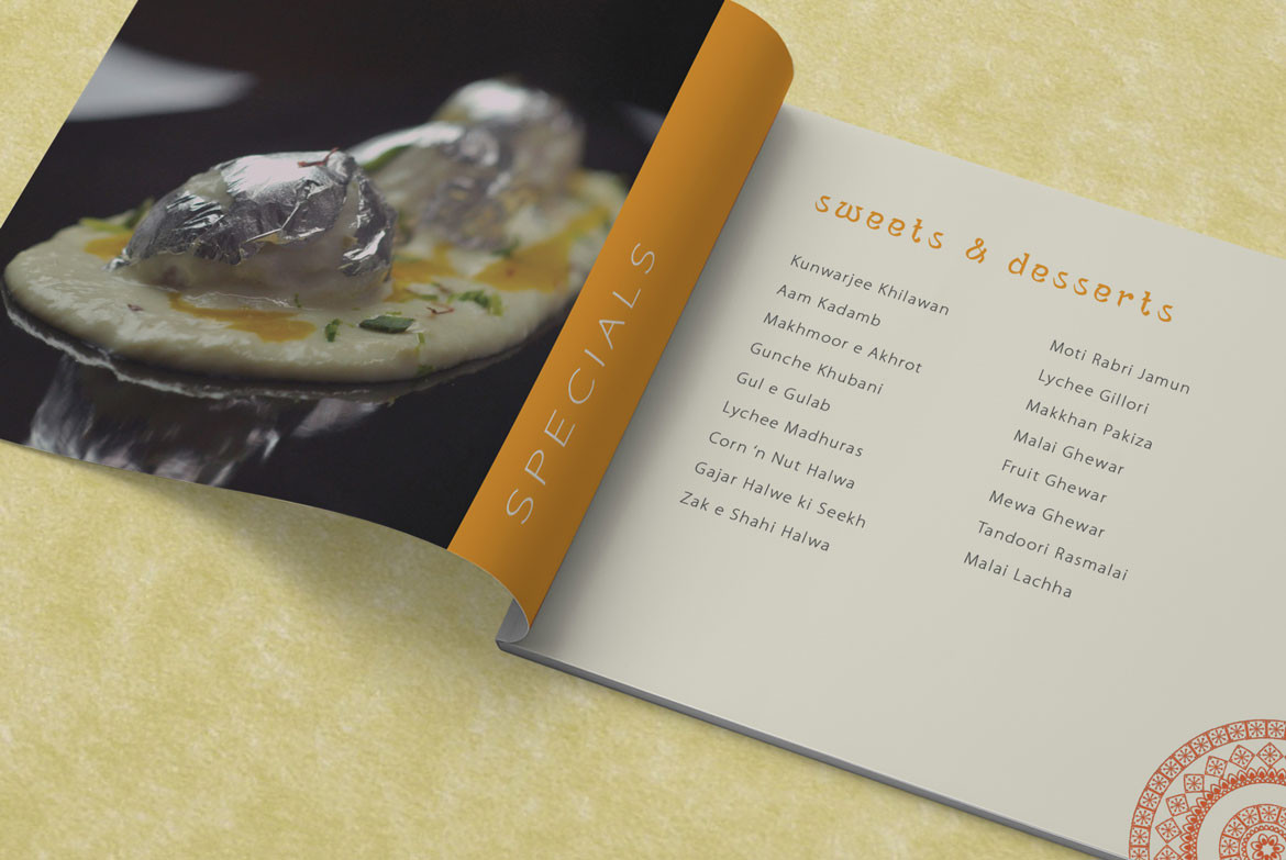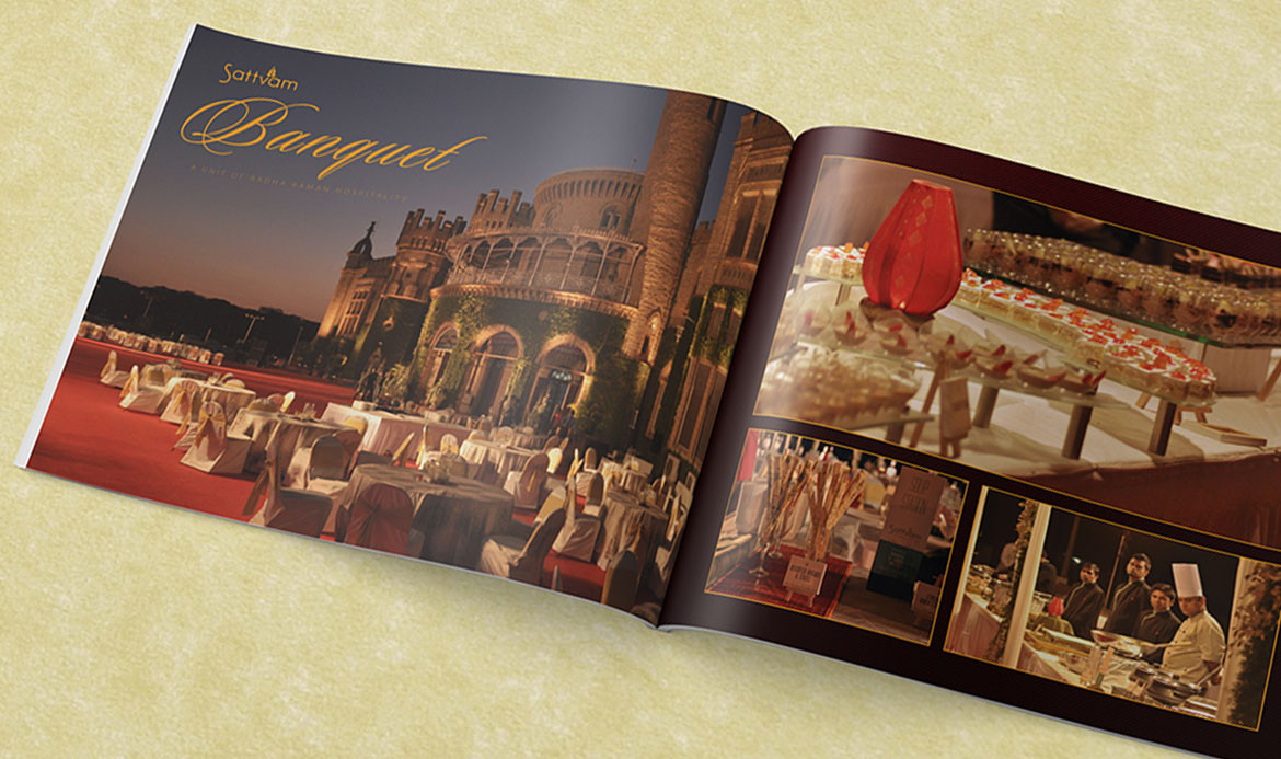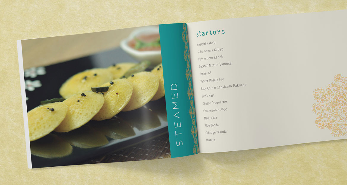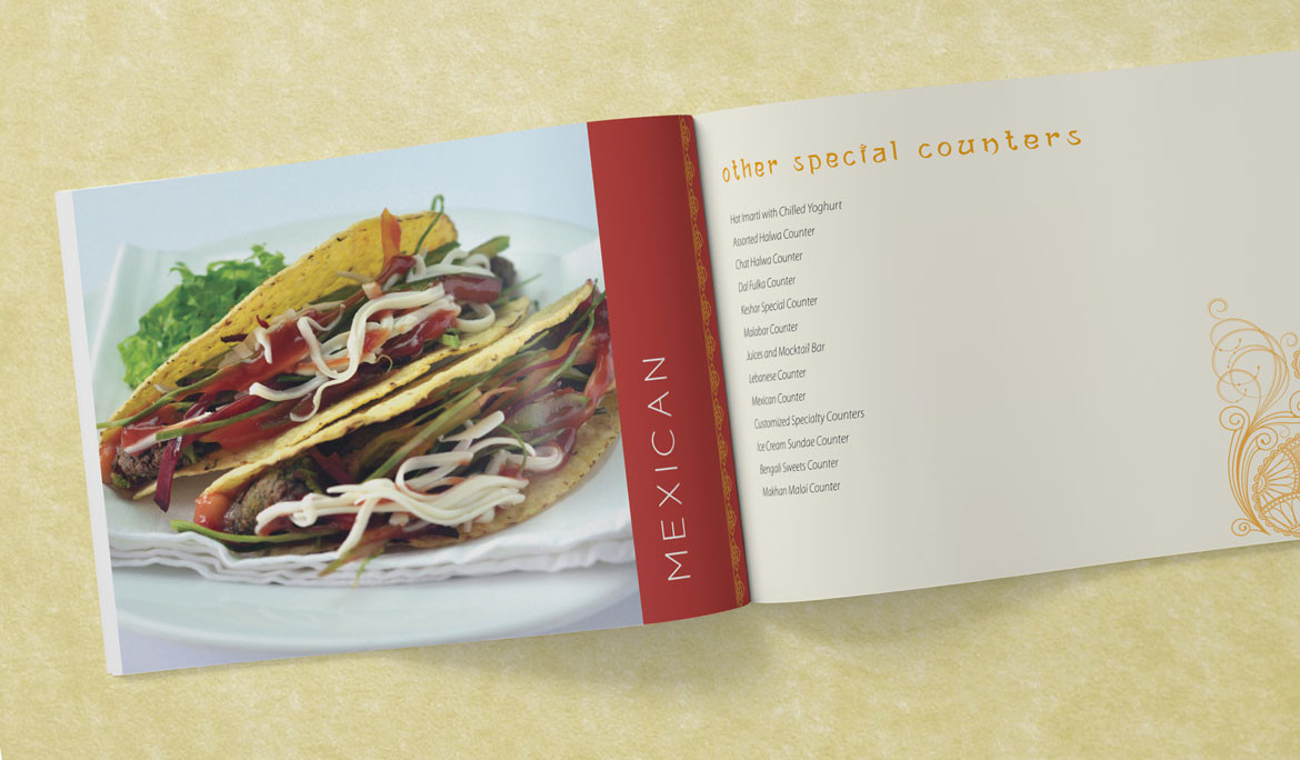 As part of Sattvam Banquet’s offerings catalogue, photos of their signature dishes were added to an elaborate menu in book form.